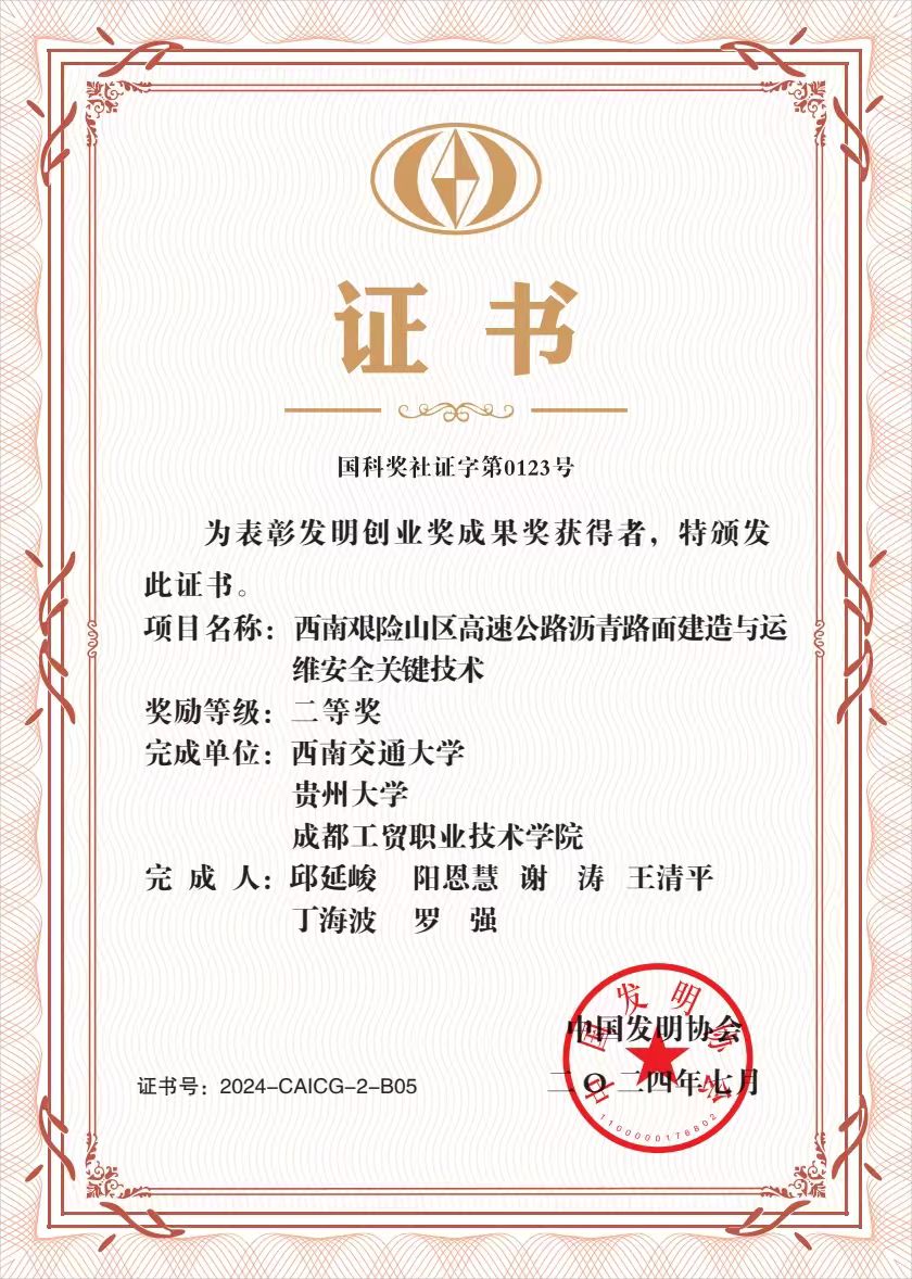 2024年6月,中国发明协会公示了第三届发明创业奖成果奖名单。公司党总支书记、经理王清平参与的《西南艰险山区高速公路沥青路面建造与运维安全关键技术》项目获得2024年度中国发明协会“发明创业奖成果奖”二等奖。此项目由西南交通大学、贵州大学、太阳成集团tyc7111cc合作共同完成,解决西南艰险山区高速公路沥青路面建造与运维安全关键技术问题。
